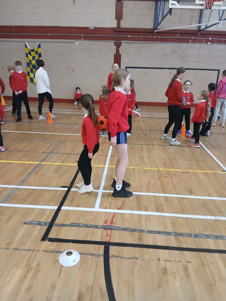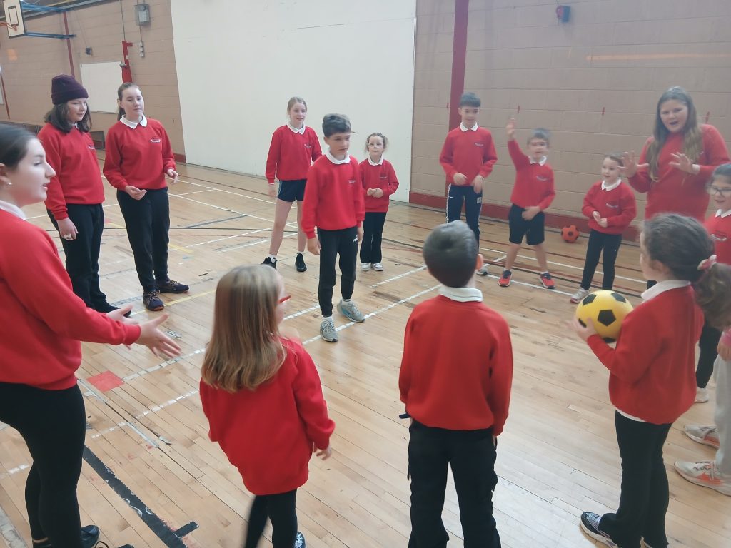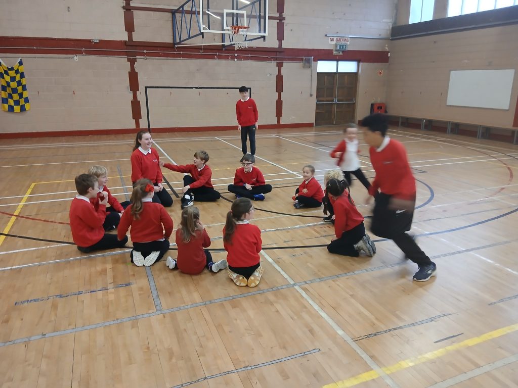 Thug Rang a 6 na naíonáin mhóra agus Rang a 1 síos go dtí an halla chun cluichí clóis a thaispeáint dóibh.