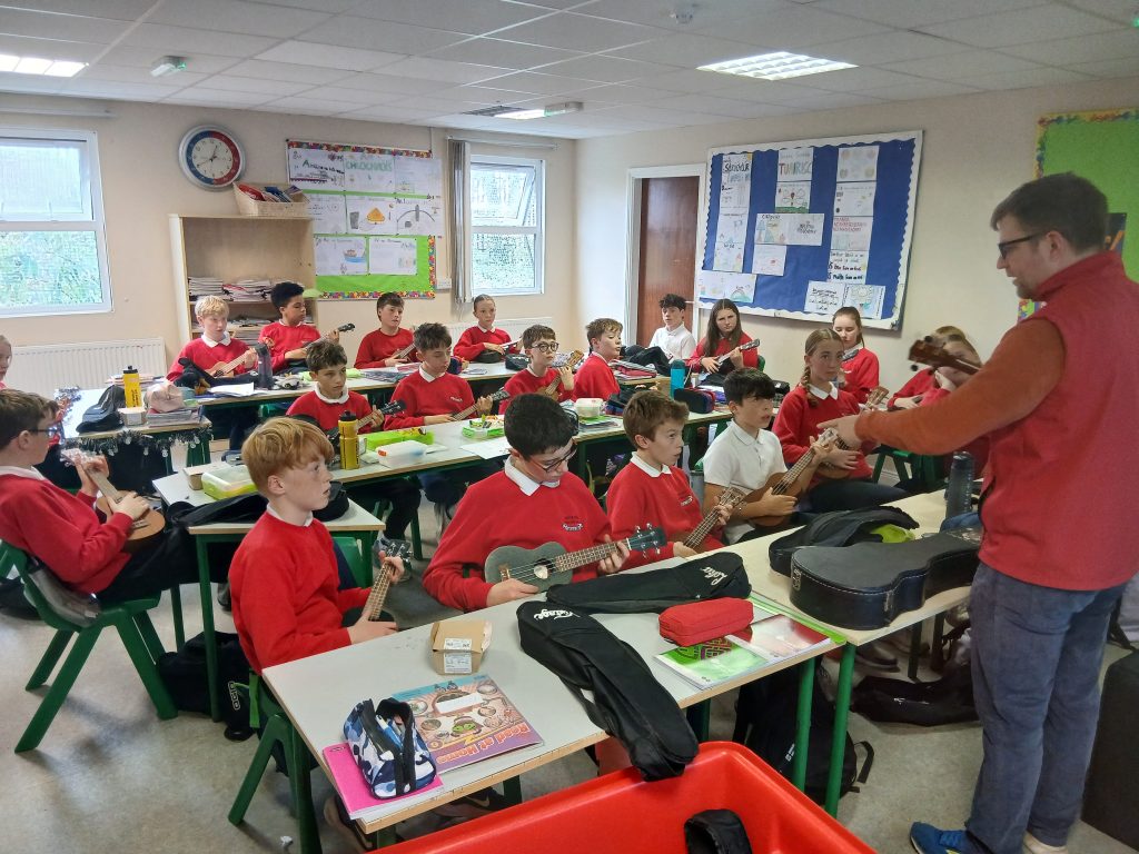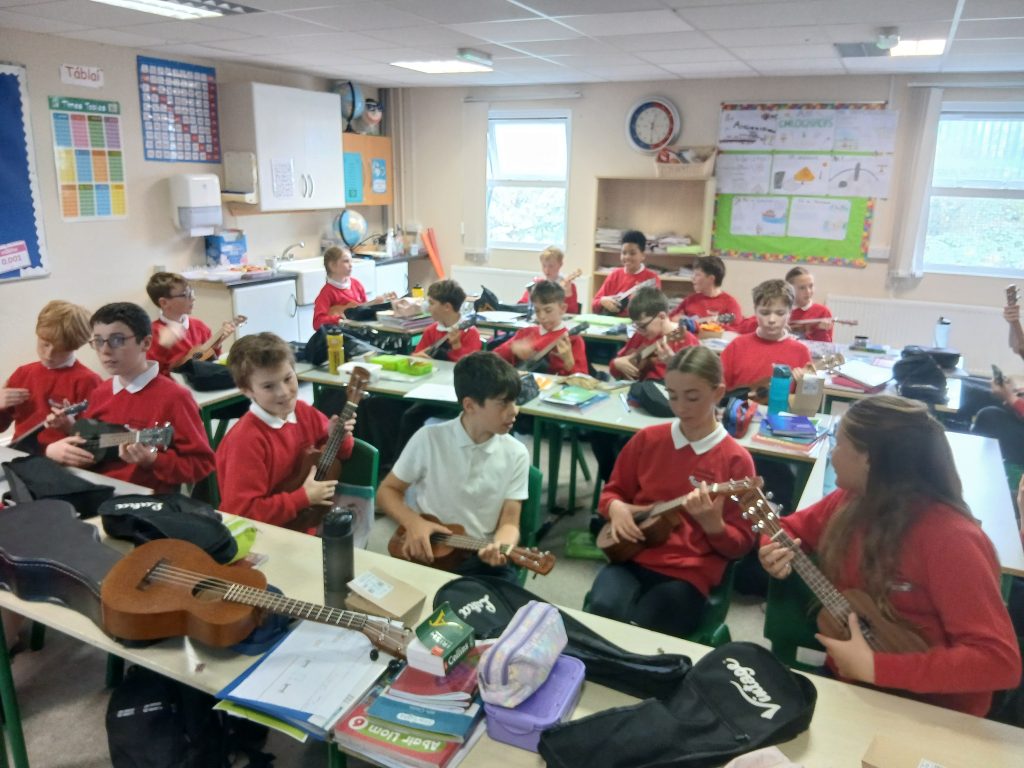 Ta Rang a 6 ag baint an-sult agus spraoi amach as na ranganna ukulele le James.
