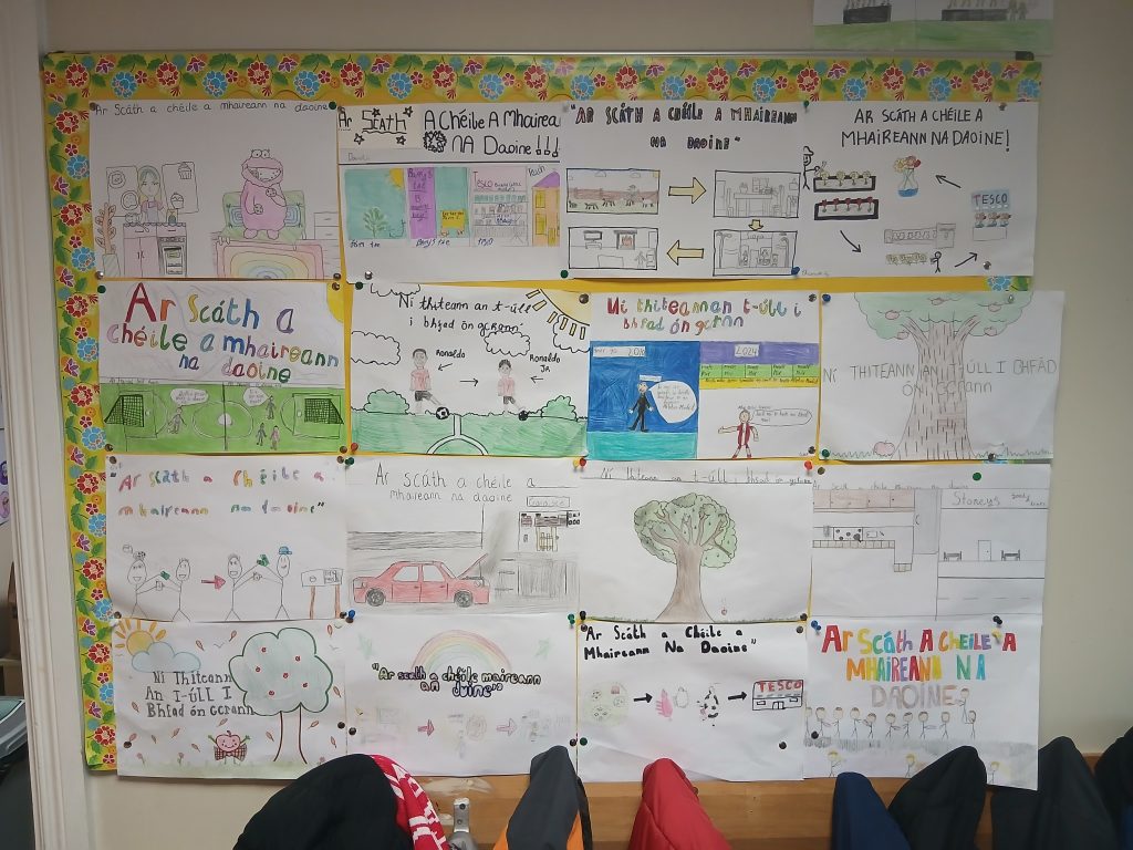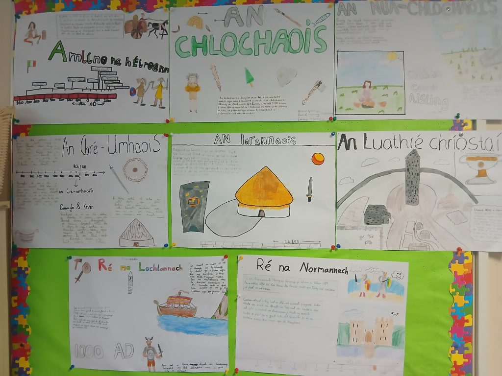 Seo roinnt obair a rinne Rang 6 sa chéad téarma maidir le rudai ar nós Oíche Shamhna, Seanraí scríobh, seanfhocail agus Stair.